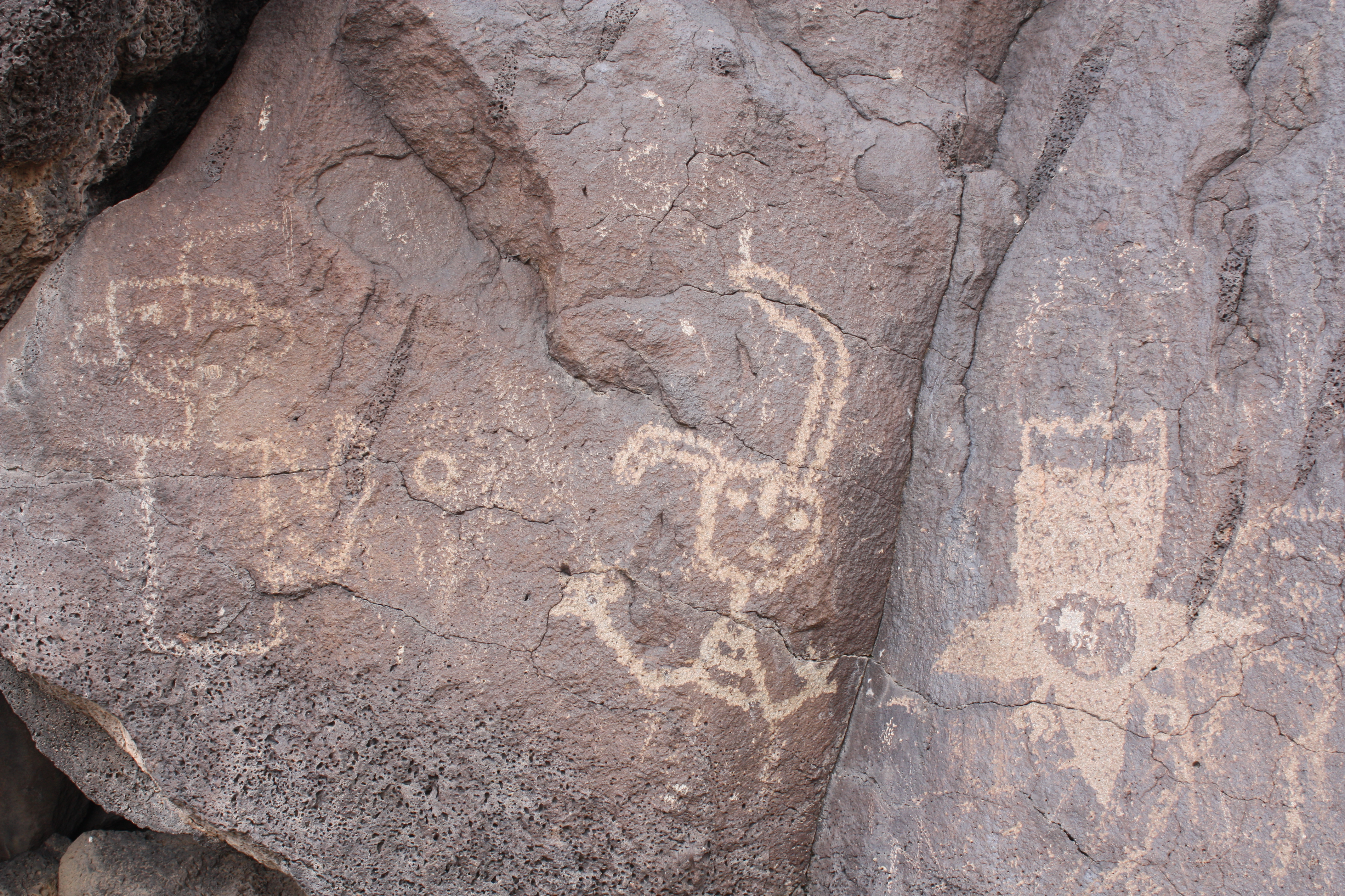 How can you tell the petroglyphs are old? Look at the “star person” above, it was carved hundreds of years ago, but recently (and by recently, I mean about 20-40 years ago) someone shot out his eye. The difference in the patina of the stone determines the age. Fresh carvings are pale and beige, older carvings have been weathered by hundreds of years of wind and rain and are much darker.