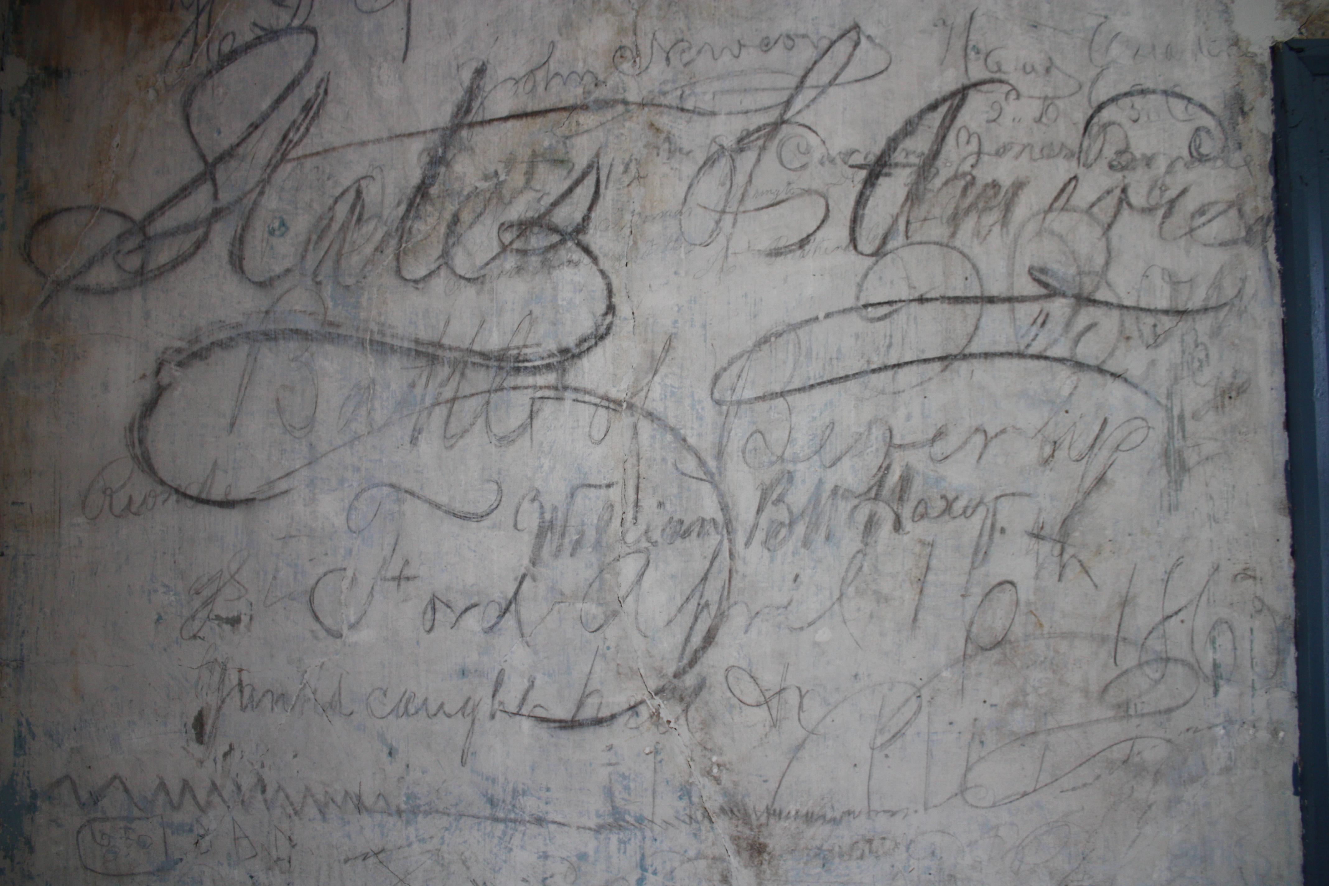 Graffiti House A Confederate hand, long ago, scratched those words in charcoal on the wall of the Graffiti House. A Union hand came along later and  wrote “United States of America,” with such flourish that the line from the “s” in States covered up the offending slogan. So it goes in Graffiti House, where multiple autographs, competing slogans, skillful portraits, and dates of significant events compete, mingle, and overlap on the walls. At the time, those idle hands couldn’t have known that their work would be preserved for future generations and provoke years of research and debate.