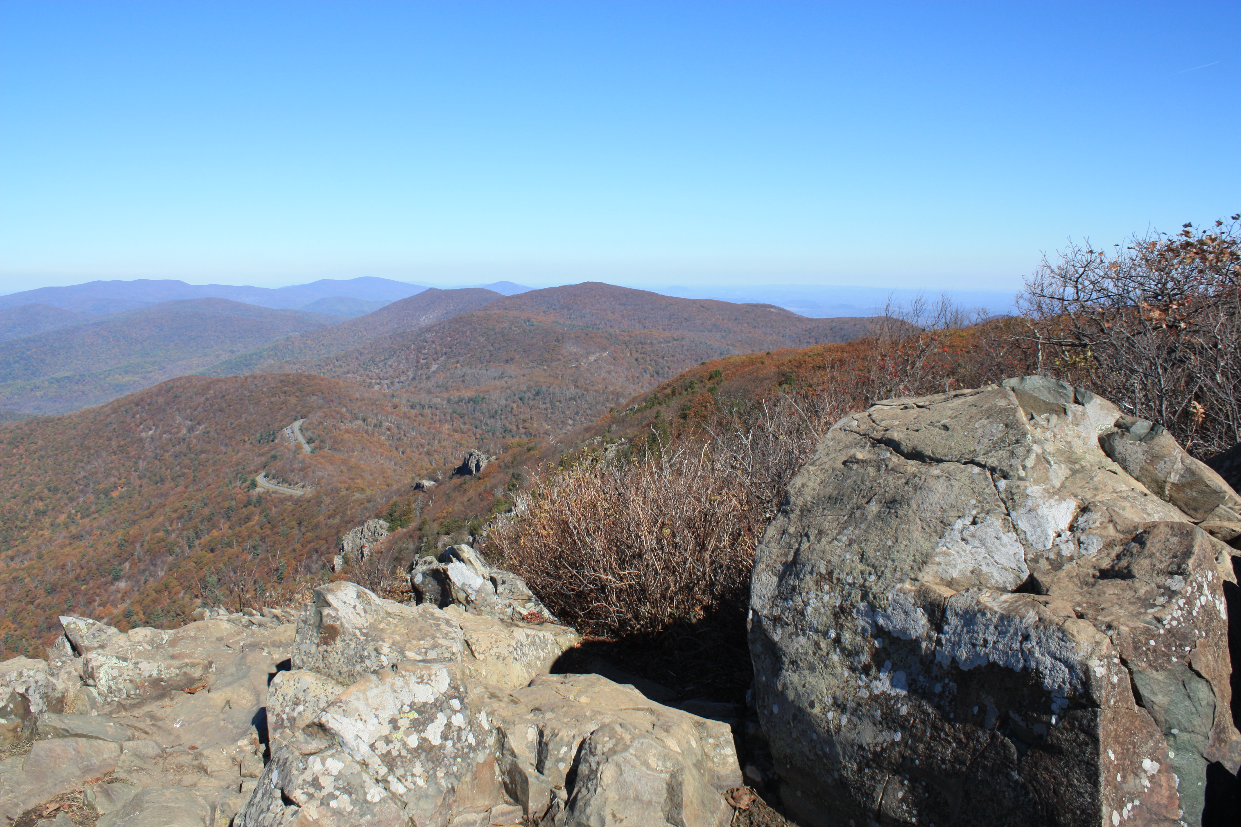 Sometimes the best trips are right in one’s own backyard. Shenandoah National Park is only 25 miles from my door, but when I was ill 25 miles seemed like 2,500 miles. Today was my first day back to nature and back to real hiking since the beginning of August, and I am grateful to be able to experience the beauty of nature. The transformation of the park from summer to fall is absolutely stunning. At the lower elevations the greens, yellows, and reds are still bright, but the higher up you go, the more muted the colors become. The peak “leaf peeping” time was right around the two weeks the park was closed for the government shutdown. The photograph above was not taken today, but several weeks ago. The park still has some green, but not that much!