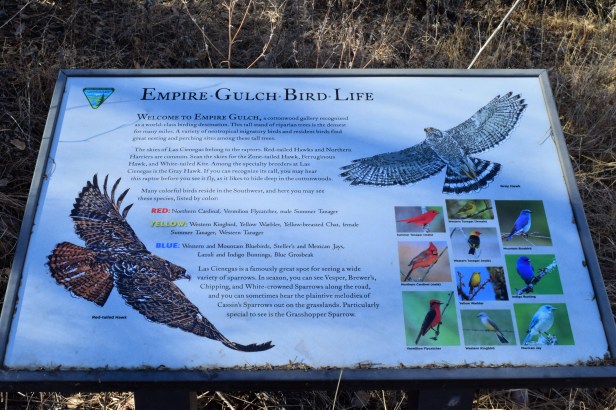 On a more positive note, Empire gulch is still a great place to visit and watch the wildlife. Although the trees are gone, the grass is taller than ever. Additionally, it’s a great place to watch for the red Vermilion Flycatchers or many other exotic, colorful birds. Raptors such as the red-tailed hawk also frequent the gulch.