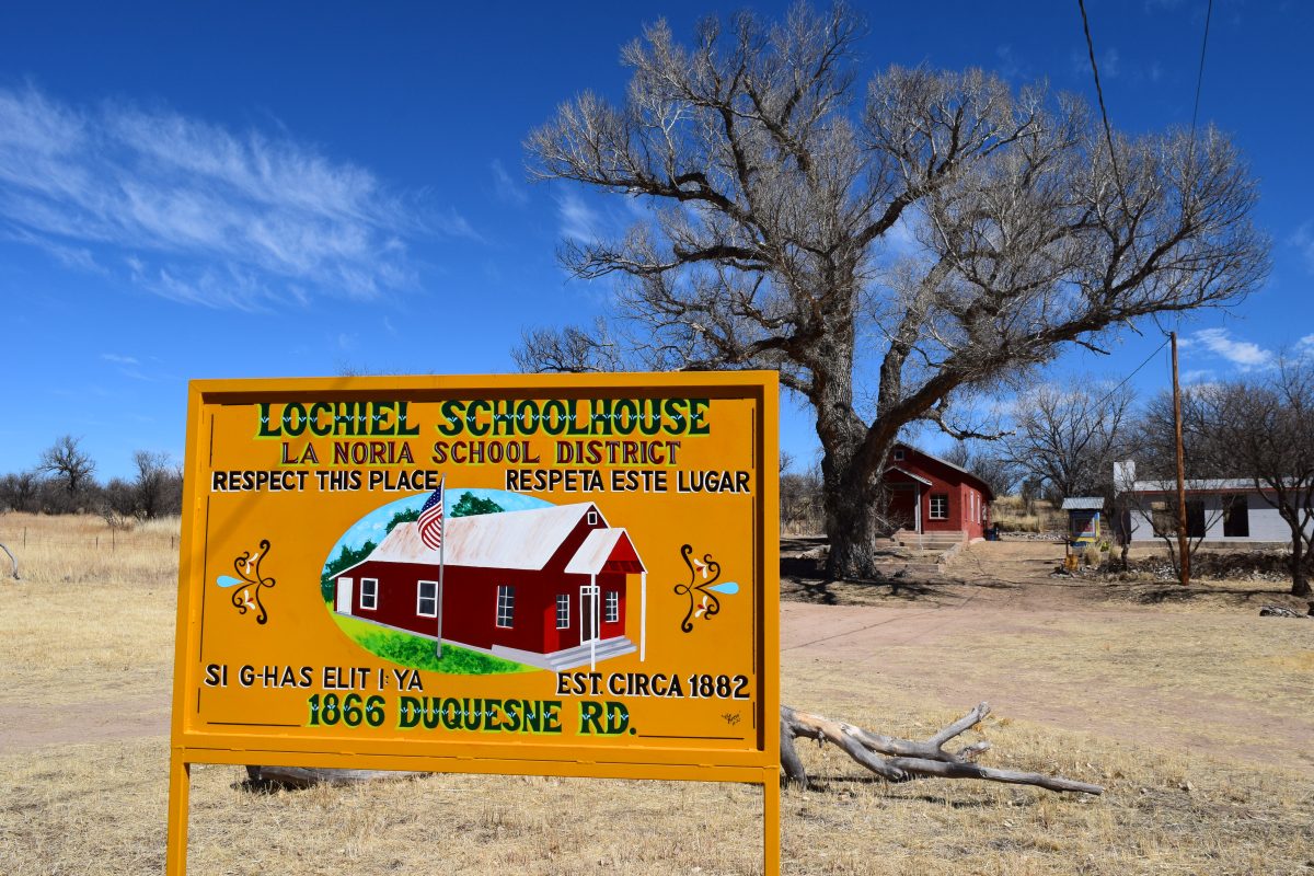 One site that is still accessible in Lochiel is is the red one-room schoolhouse. This schoolhouse is maintained by the Patagonia museum and there’s a push to recognize it as a national historic site. The schoolhouse was founded in 1882. The building itself is locked, but you can walk around the grounds. The rest of Lochiel is private property and fenced off from the public. You can see the old Lochiel church up on a hill through a fence. The old customs house is also visible. The border fence is visible and runs directly behind the church.