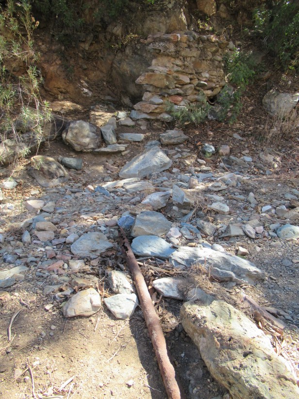 After exploring what remains of the historic site and cemetery, it’s just over a mile up to the actual springs. There is a sign full of shotgun holes indicating that something is to the left. I guessed correctly and followed this sign at the only fork in the road up to the springs. You will not see another sign, but it is very obvious when you arrive at the springs. There is a man-made wall surrounding the springs ninety-degrees from the side of the hill. This wall looks similar to the one constructed around the springs at Fort Bowie. A little exploration will reveal a few pieces of rusted pipe, a fenced-in basin a little way up the hill, and a concrete water-catchment device that looks like it may have been constructed by the WPA in 1937.
