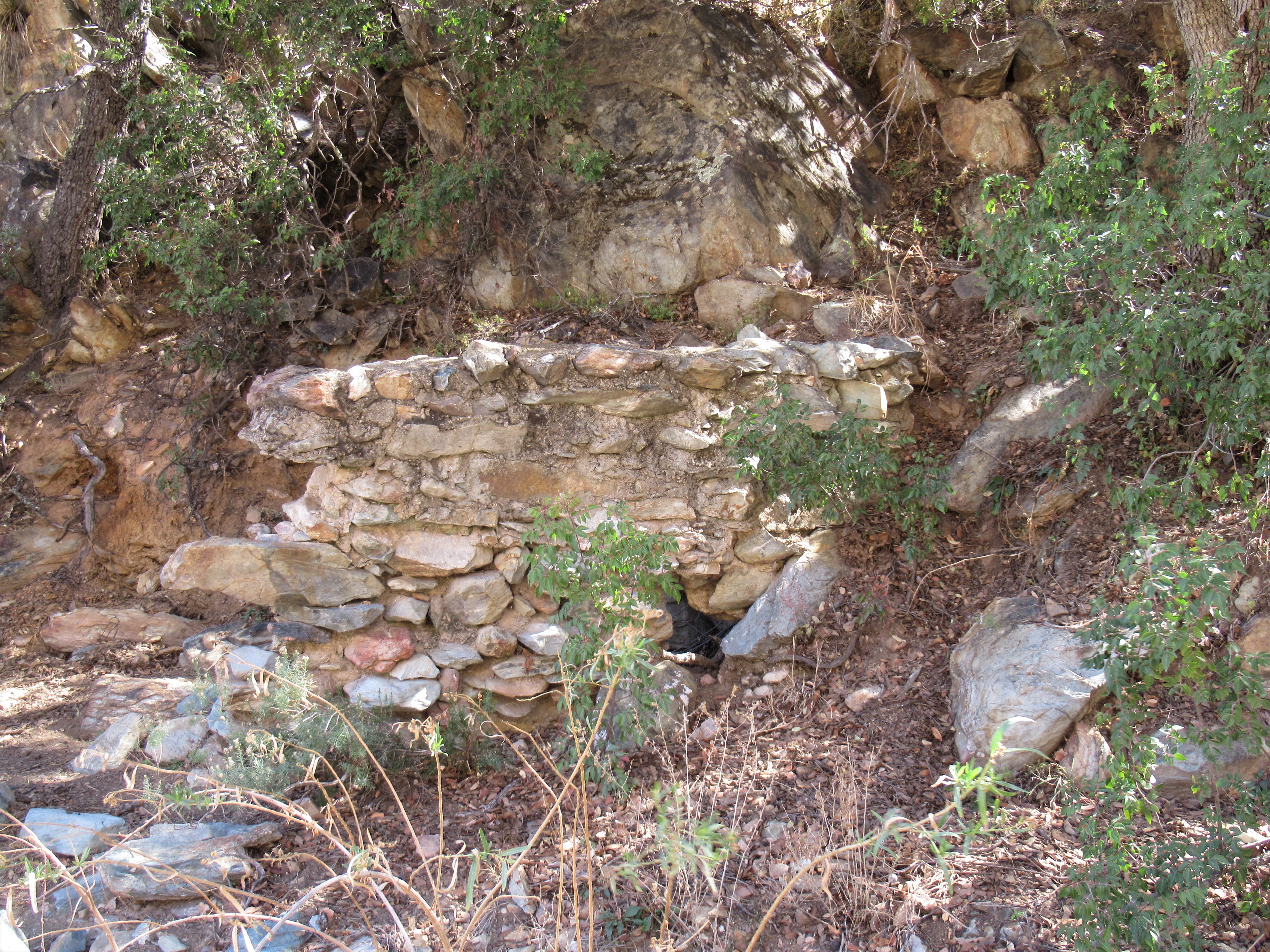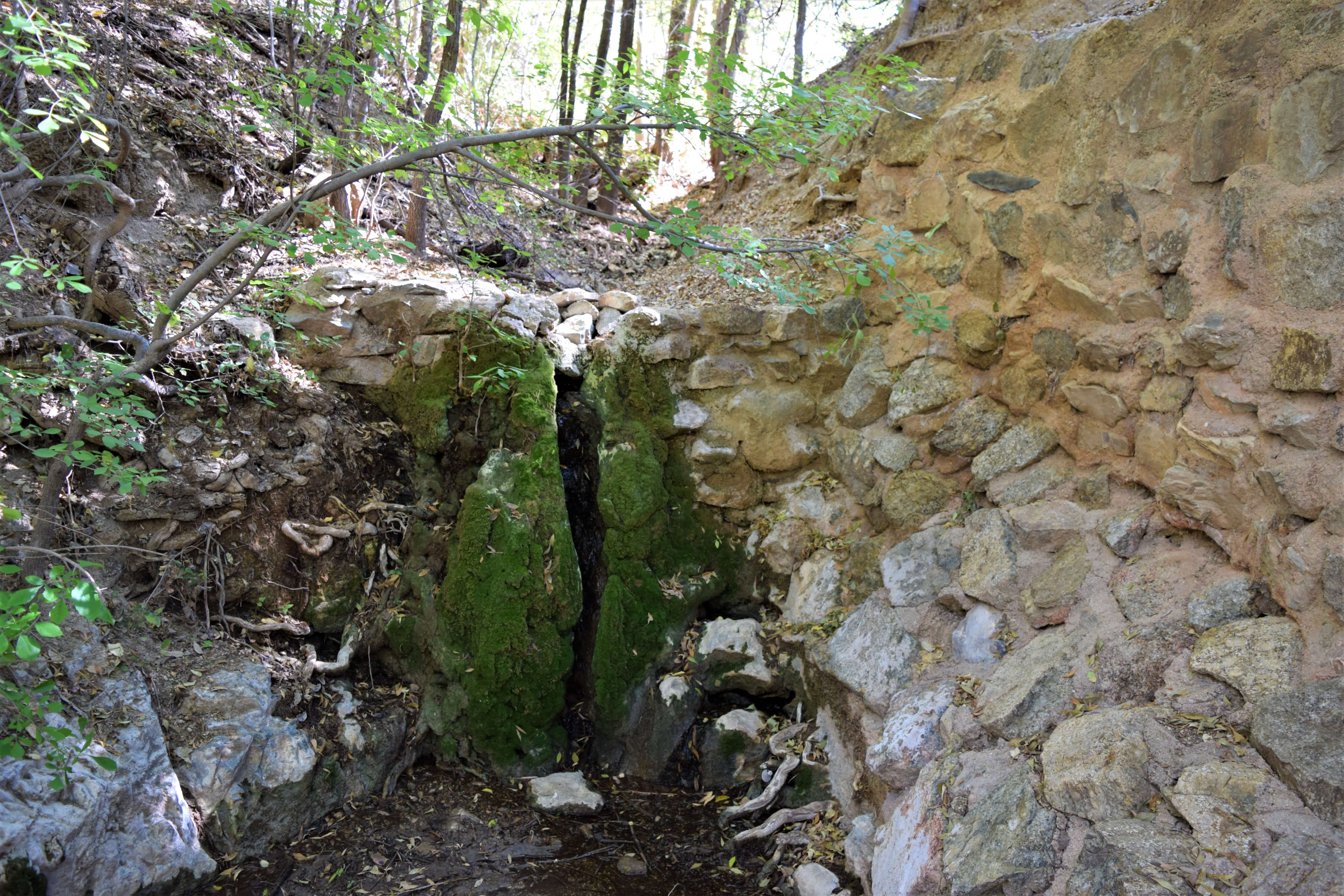 After exploring what remains of the historic site and cemetery, it’s just over a mile up to the actual springs. There is a sign full of shotgun holes indicating that something is to the left. I guessed correctly and followed this sign at the only fork in the road up to the springs. You will not see another sign, but it is very obvious when you arrive at the springs. There is a man-made wall surrounding the springs ninety-degrees from the side of the hill. This wall looks similar to the one constructed around the springs at Fort Bowie. A little exploration will reveal a few pieces of rusted pipe, a fenced-in basin a little way up the hill, and a concrete water-catchment device that looks like it may have been constructed by the WPA in 1937.